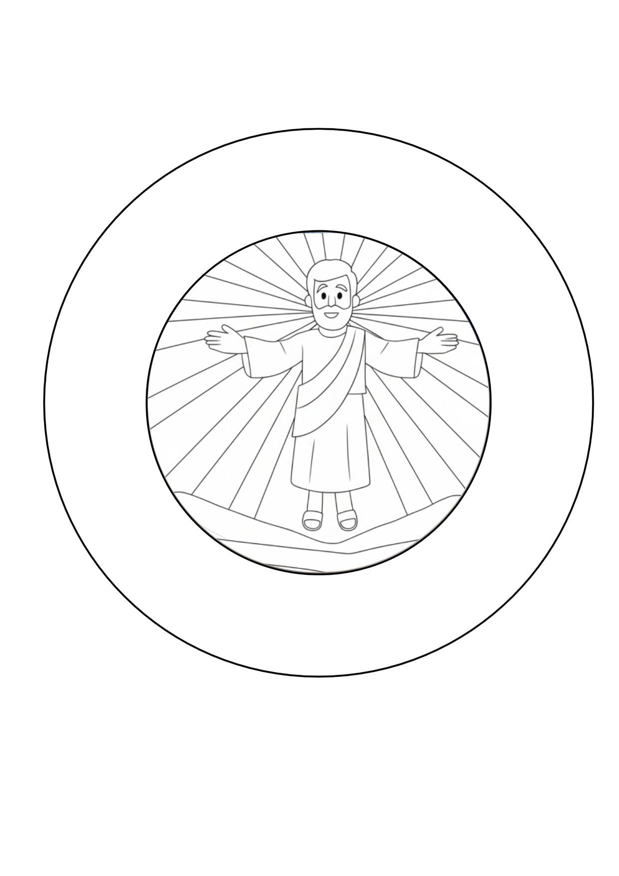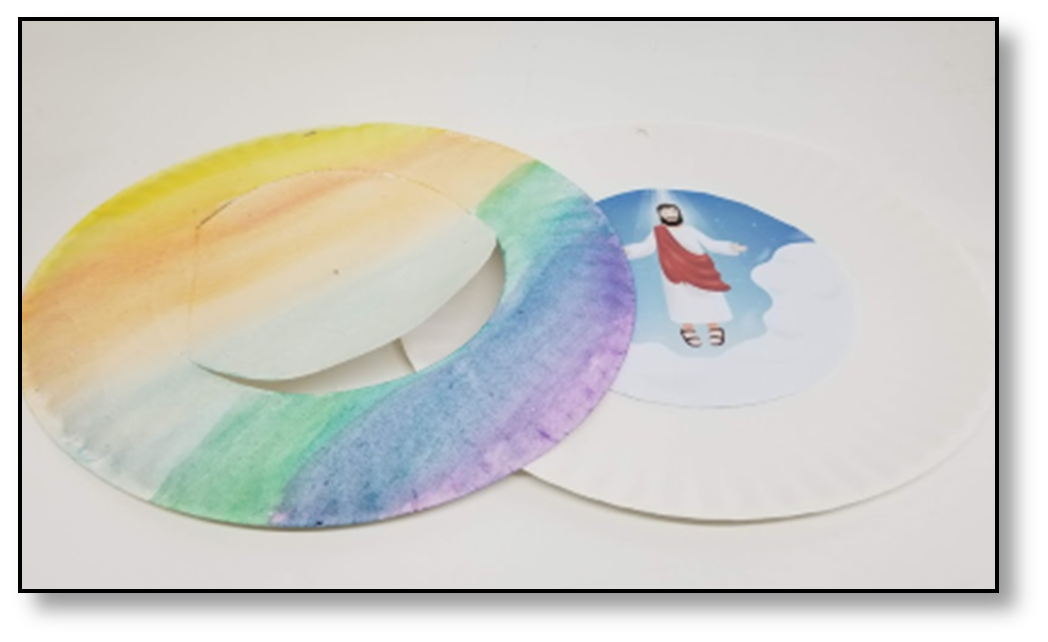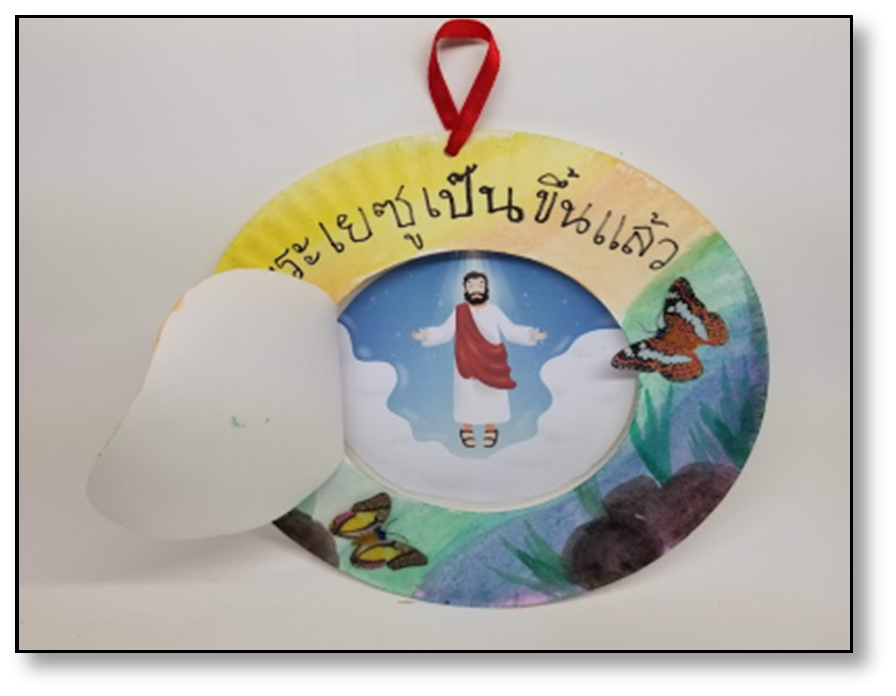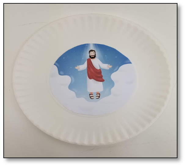 - ติดรูปพระเยซูที่ตัดเป็นวงกลมแล้วลงตรงกลางจานกระดาษปกติ (ที่ไม่ได้เจาะวงกลม) แล้วพักไว้