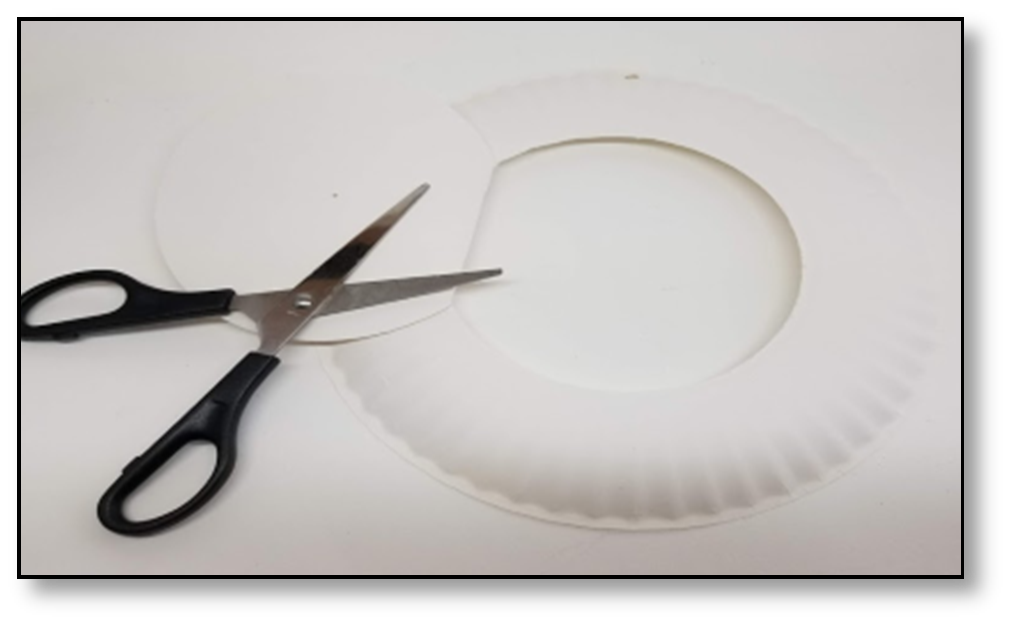 - ก่อนชั้นเรียนคุณครูเตรียมเจาะวงกลมตรงกลางจานกระดาษให้สามารถเปิดแง้มคล้ายๆ ประตูได้ตามที่แสดงในรูป เด็กแต่ละคนจะได้รับจานกระดาษปกติ 1 ใบและจานกระดาษที่เจาะตรงกลางอีก 1 ใบ เพื่อใช้ประกบกันให้มีลักษณะคล้ายอุโมงค์ที่สามารถเปิดด้านหน้าได้