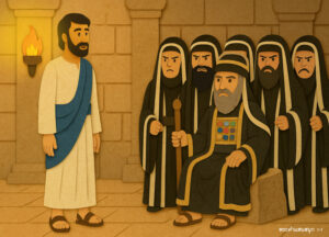 รูปภาพที่ 1 หลังจากยูดาสพาพวกทหารและเจ้าหน้าที่ของพวกยิวไปจับกุมพระเยซูที่สวนเกทเสมนีแล้ว พวกเขาก็พาพระเยซูไปยังบ้านของมหาปุโรหิต คายาฟาสคนนี้แหละที่แนะนำพวกยิวว่า ควรที่จะให้คนหนึ่งตายแทนประชาชนทั้งหลาย หัวหน้าพวกยิวพยายามหาพยานเท็จมาปรักปรำพระเยซูเพื่อจะได้ฆ่าพระองค์ พวกเขาถ่มน้ำลายรดหน้าและทุบตีพระองค์ บางคนตบหน้าและเยาะเย้ยพระองค์