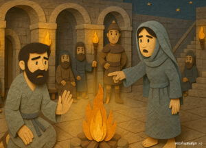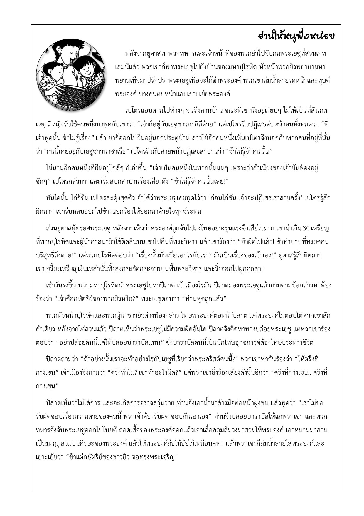 รูปภาพที่ 2 เปโตรแอบตามไปห่างๆ จนถึงลานบ้าน ขณะที่เขานั่งอยู่เงียบๆ ไม่ให้เป็นที่สังเกตเห็น มีหญิงรับใช้คนหนึ่งมาพูดกับเขาว่า “เจ้าก็อยู่กับเยซูชาวกาลิลีด้วย” แต่เปโตรรีบปฏิเสธต่อหน้าคนทั้งหมดว่า “ที่เจ้าพูดนั้น ข้าไม่รู้เรื่อง” แล้วเขาก็ออกไปยืนอยู่นอกประตูบ้าน สาวใช้อีกคนหนึ่งเห็นเปโตรจึงบอกกับพวกคนที่อยู่ที่นั่นว่า “คนนี้เคยอยู่กับเยซูชาวนาซาเร็ธ” เปโตรถึงกับส่ายหน้าปฏิเสธสาบานว่า “ข้าไม่รู้จักคนนั้น”