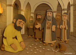 ยูดาสรู้สึกผิดมาก เขาเขวี้ยงเหรียญเงินเหล่านั้นทิ้งลงกระจัดกระจายบนพื้นพระวิหาร และวิ่งออกไปผูกคอตาย