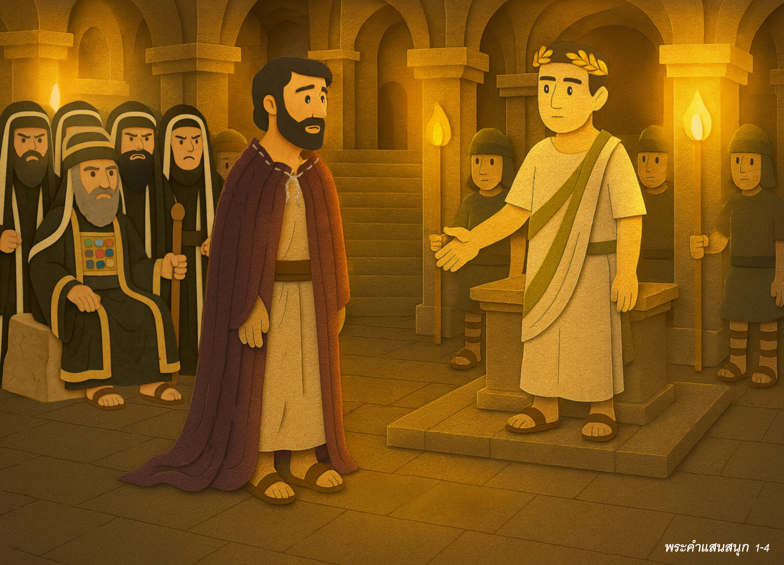 รูปภาพที่ 4 เช้าวันรุ่งขึ้น พวกมหาปุโรหิตนำพระเยซูไปหาปีลาต เจ้าเมืองโรมัน (ในเวลานั้น อิสราเอลตกเป็นเมืองขึ้นของโรม) ปีลาตมองพระเยซูแล้วถามตามข้อกล่าวหาฟ้อง ร้องว่า “เจ้าคือกษัตริย์ของพวกยิวหรือ?” พระเยซูตอบว่า “ท่านพูดถูกแล้ว”